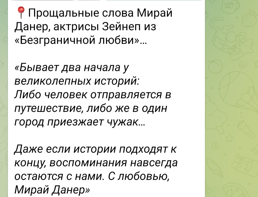 Грустно осознавать зная что ждёт в следующей серии, ждали новость о покидании каста Дидем, а получили Зейнеп… без неё нет смысла и 3го сезона.... Мирай 💔